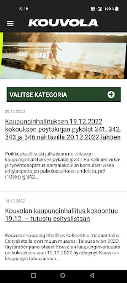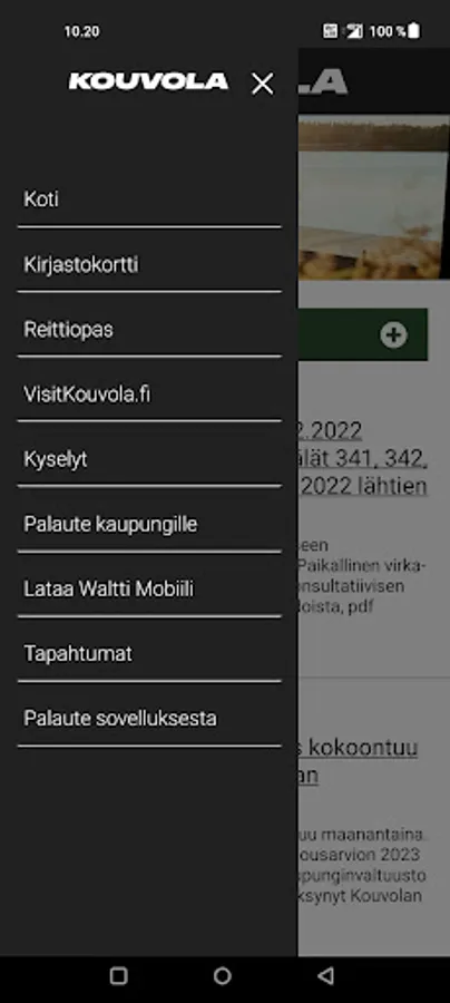 The Kouvola Mobile application has been developed as a service channel for residents and visitors. Through the Kouvola Mobile app, residents can, for example, leave feedback through the feedback service, answer city inquiries or, for example, search for a bus route through a route guide. The mobile app also helps track events directly using a smart device.