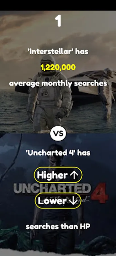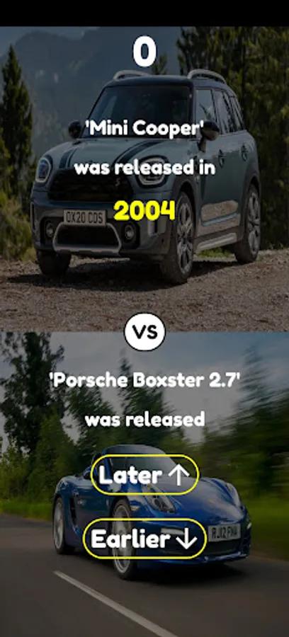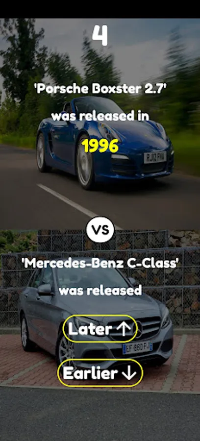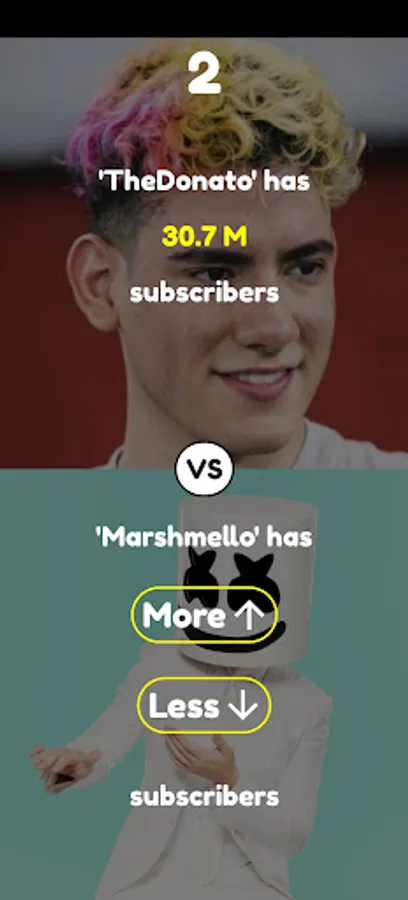 The game have four game modes. In first game mode you guess, which word has more average monthly searches on google, in the second game mode you guess, which car model was released earlier, in the third game mode you guess which country has bigger population, in the fourth game mode you guess, which YouTube channel has more subscribers.