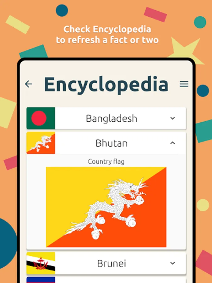 World Quiz Encyclopedia includes 214 info-cards about Countries of the world. World Quiz: Flags & Countries - 2.0 app includes more than 4000 questions about the World countries and their flags in total!