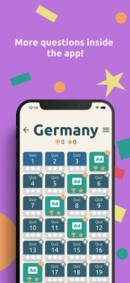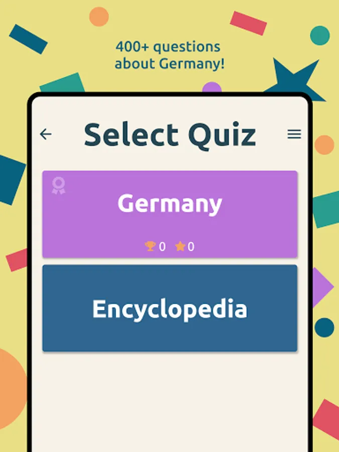 A little bit of challenge makes everything better! In this Germany Quiz app, we offer you a fair challenge: quizzes at the beginning are quick and easy, but with every completed quiz a new, more difficult quiz will be unlocked.