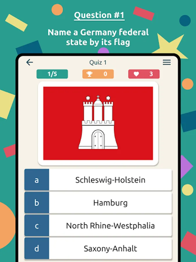 Each of Germany Lands has its own Flag, Territory and Capital. Our trivia app has questions about all of them!