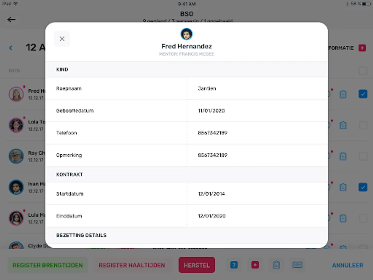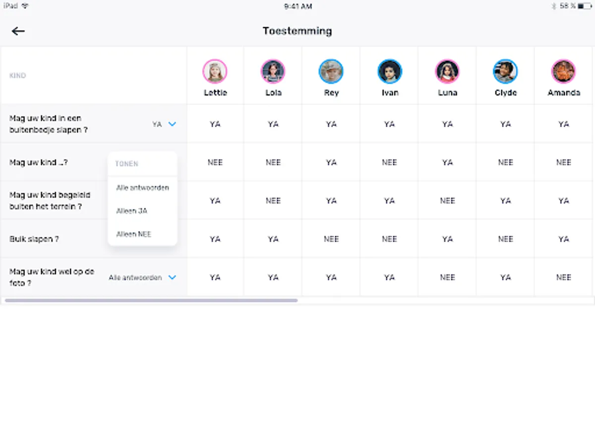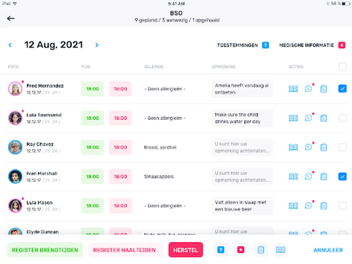 Thanks to the simple and smart screen, you can see with a few clicks exactly which child has which allergy, who can or cannot be photographed and who to call if the child is sick.