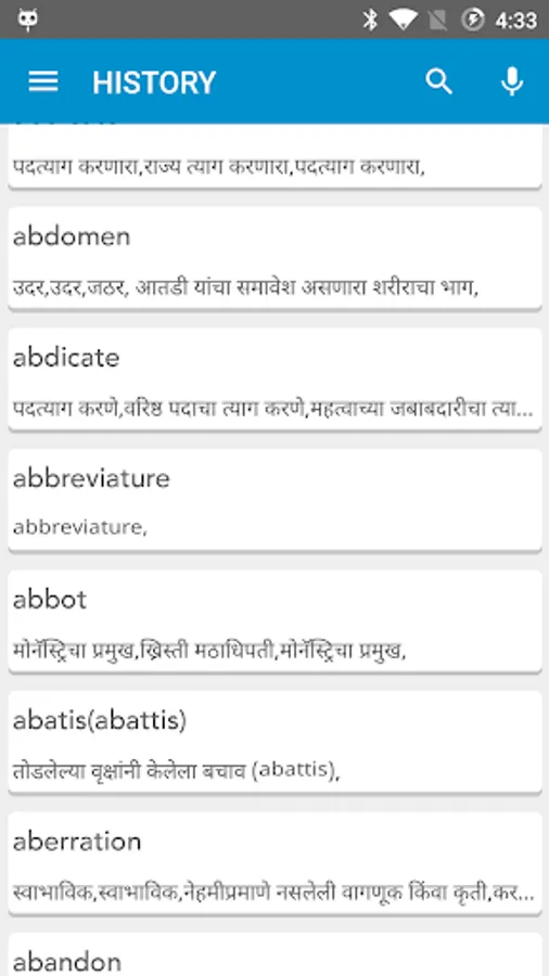 - Settings: you can customize the dictionary by adjusting text size, setting English/Marathi word color, facility of daily notification, by setting notification time, setting option for clearing history and option for clearing favorites.