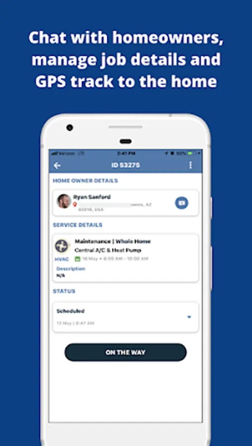 STEP 2. Once your homeowner approves your job acceptance, make sure you have the necessary tools and equipment for the job. For instant/Now Requests be sure to arrive within 90 minutes of the request being made. Communicate with the homeowner often and tap “ON THE WAY” to let them know you’re arriving. You can GPS track from there!
