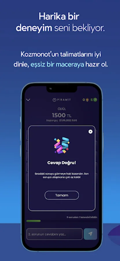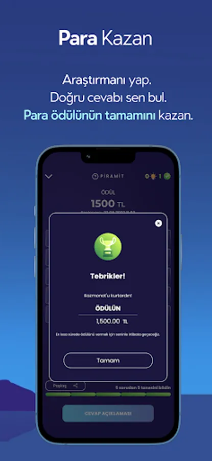 In the pyramid format, there are five questions and a single winner. There is no time limit, but you have to be faster than your opponents. You must answer the questions in order and reach the fifth question. The most enjoyable feature of the format is that each question is interconnected. The first person to reach the fifth question and write the correct answer to the fifth question in the answer box wins the entire prize money, so the contest ends for all users. The announcement of the new competition date is made within the application. Each Pyramid competition takes you to a different adventure, a different path.