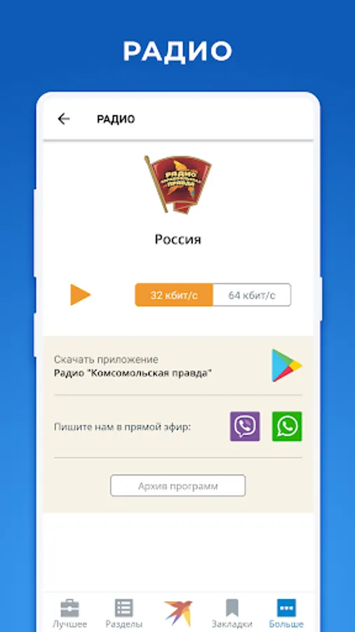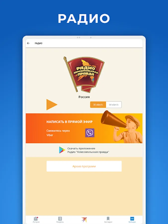 Listen to podcasts and live radio "KP", watch photos and videos through the built-in player right in the application. Save articles to bookmarks for offline reading.