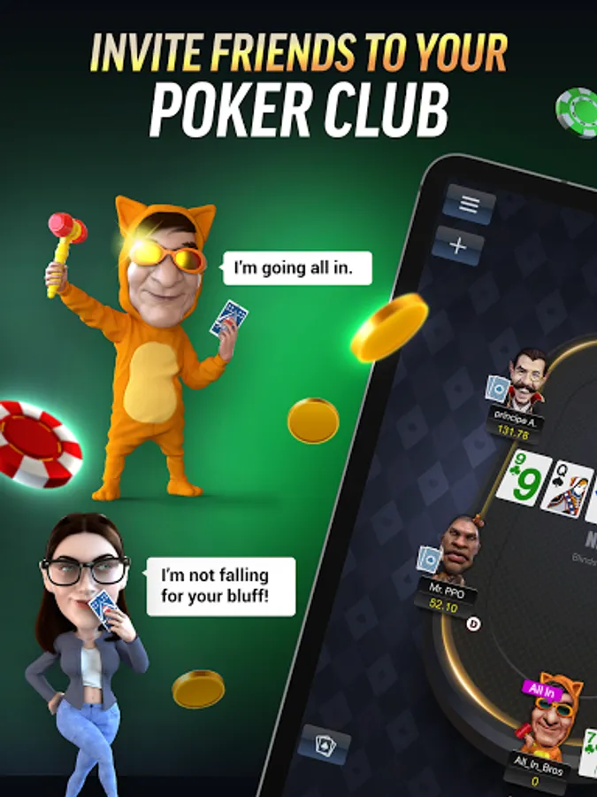Play with friends and share your worst beats and biggest wins with the hand replayer. Toss emoji at your friends, chat with friends, design your Club’s events and manage poker tournaments, all with a few taps.