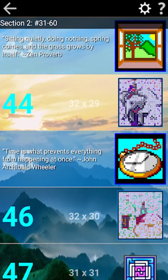 Finish solving to see the miniature picture that you have created. As an extra reward you get a quote related in some way to the picture. Witty or wise, it will give you a little something to think about as you go on to the next puzzle.