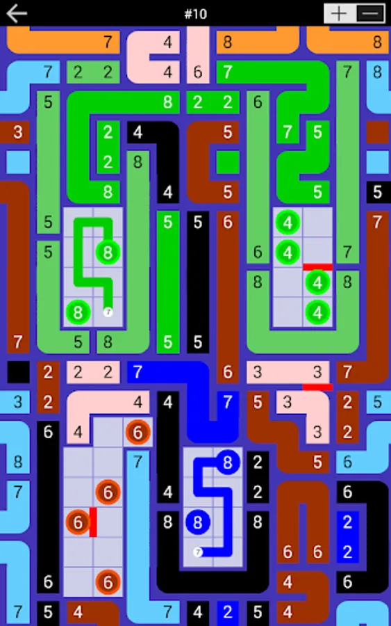 Draw bright, bold lines of color to make paths connecting pairs of colored numbers. The length of each path must equal the numbers you are connecting.