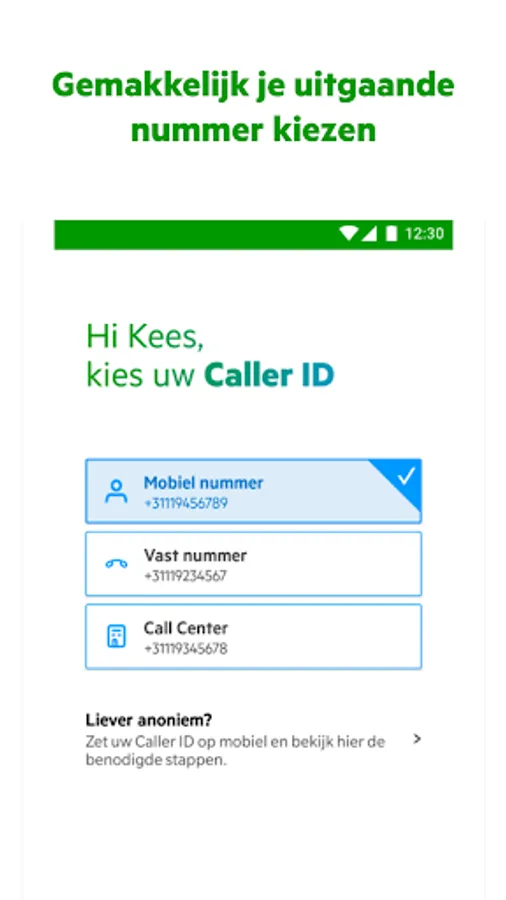 With Flexible Caller ID from KPN you decide for yourself which phone number you call from your mobile phone. This can be your own mobile number or, for example, the fixed number of the call center. This allows you as a user to protect your mobile number from your customers and ensure that the incoming calls land in the right place within your organization.