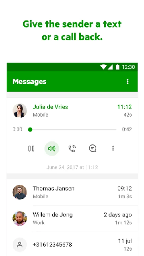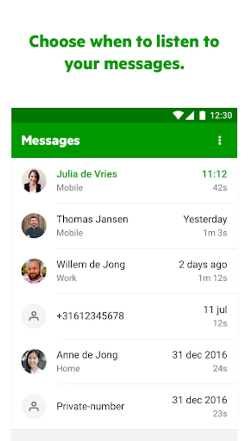 The KPN VoiceMail app gives you a full overview of your voicemail messages. You no longer have to suffer through long, automated phone menus. Choose which message you want to listen to first, immediately send a text message to the caller, or return their call straightaway using the app. It’s just that easy!