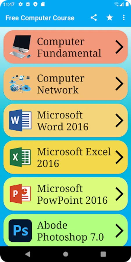 In this Application you can find All related Computer Course Like Computer Fundamental, Computer Network, Microsoft (Word, Excel, PowerPoint) 2016.