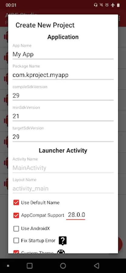 - Project Creation: Create projects with more customization options than AIDE. You can define the application and package name (only options available in AIDE), minSdkVersion and targetSdkVersion, Activity name and main layout, among other things. The project also comes with some extra features like a menu.