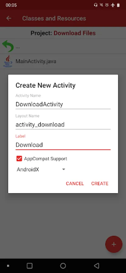 - Creating Activities: With AIDE Studio, you can navigate to the desired folder (within your source code in the "java" folder) and easily create Activities. Just choose the class name and layout, and choose to use AppCompatActivity. The process of creating java and xml files (class and layout, respectively) is done automatically, as is the declaration of Activity in AndroidManifest.