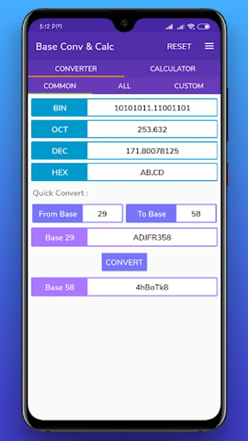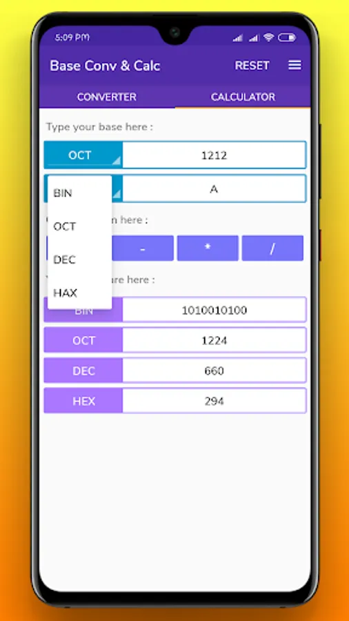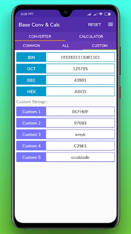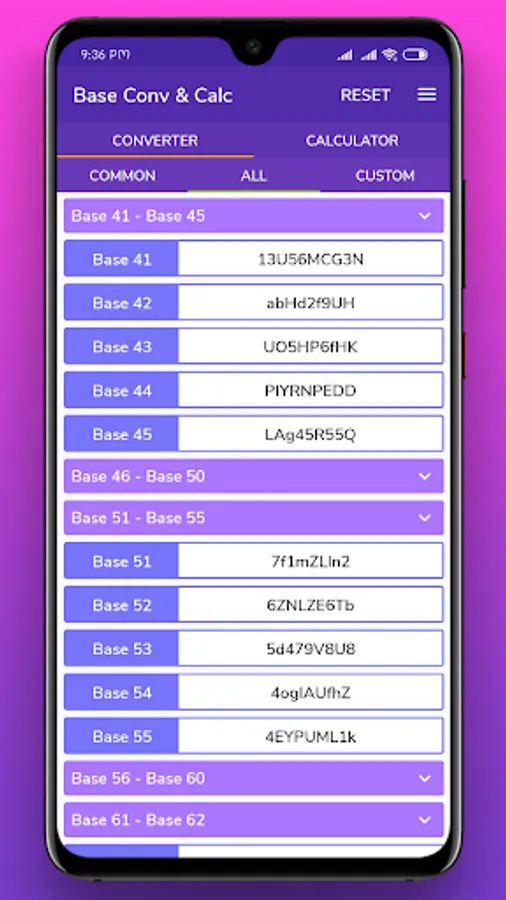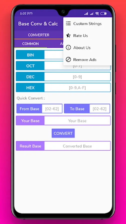 App includes the popular bases like : BIN (binary - base2), OCT (octal - base8), DEC (decimal - base10) and HEX (hexadecimal - base16).