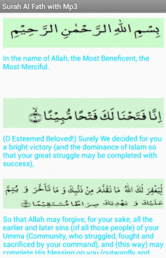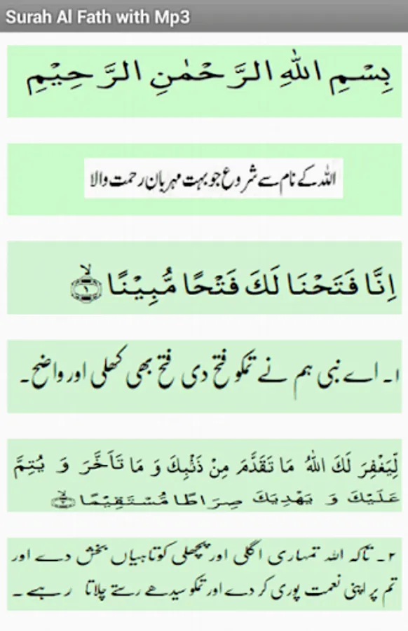 • It includes audio/mp3 and written text of Surah ad Fath along with the translation /tarjuma – available in both English and Urdu.