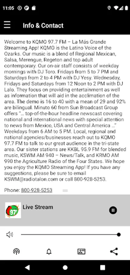 Welcome to KQMO 97.7 FM – La Más Grande Streaming App! KQMO is the Latino Voice of the Ozarks. Our music is a blend of Regional Mexican, Salsa, Merengue, Regeton and top adult contemporary. Our on-air staff consists of weekday mornings with DJ Toro. Fridays from 5 to 7 PM and Saturdays from 2 to 4 PM with DJ Yesy. Wednesday, Fridays and Saturdays from 12 Noon to 2 PM with DJ Lalo. They focus on providing entertainment as well as information that will aid in the acclimation of the area. The demo is 16 to 40 with a mean of 29 and 92% are bilingual.