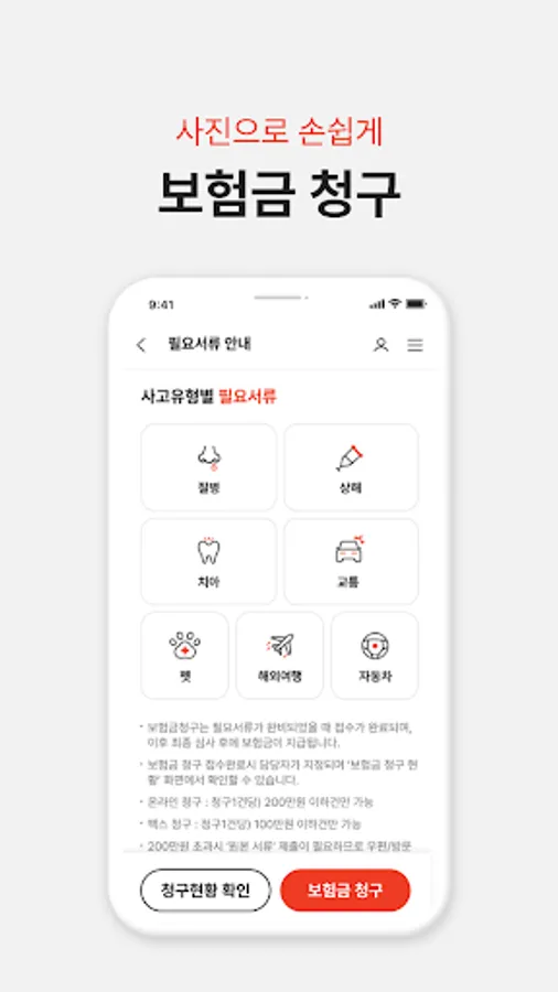 1. Compensation/insurance claim - Insurance claim, insurance claim status, premium premium calculation, information on required documents, accident data transmission, required documents transmission, compensation details inquiry