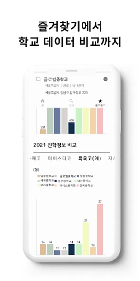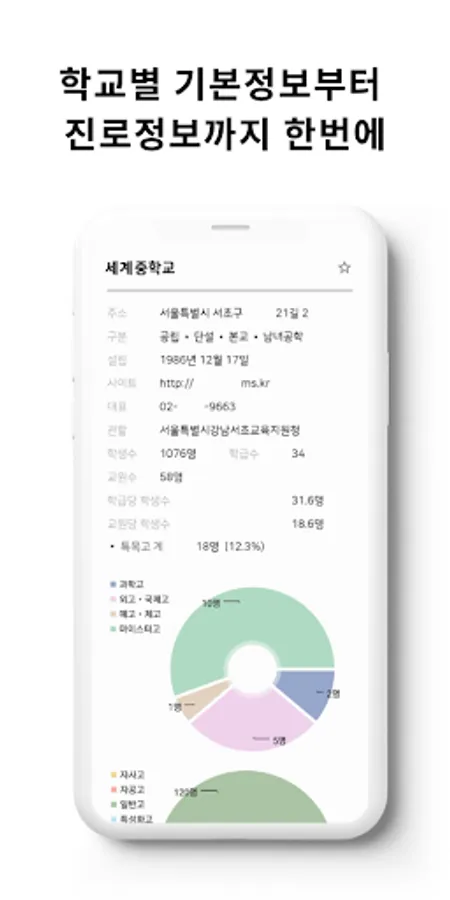 Middle school: The number of graduates for each school, the number of high school students entering high school, the number and percentage of students who entered special high schools (foreign language high schools, international high schools, arts high schools, and Meister high schools), private high schools, self-gong high schools, general high schools, and specialized high schools are provided in a graph.