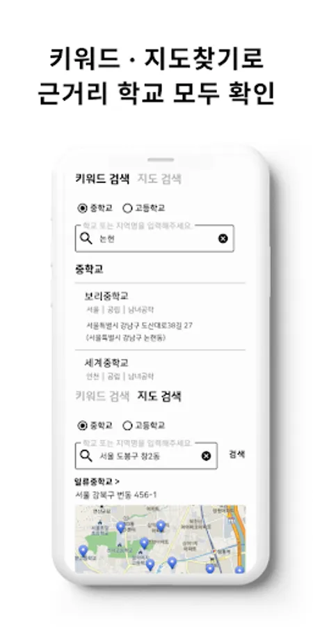 Search for a middle school or high school on the map by area or school name. All middle schools or high schools within a two-kilometre radius of the area or school are displayed. It is easy to check the schools at a glance on the map in case of middle school and high school short-distance assignments.