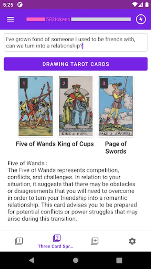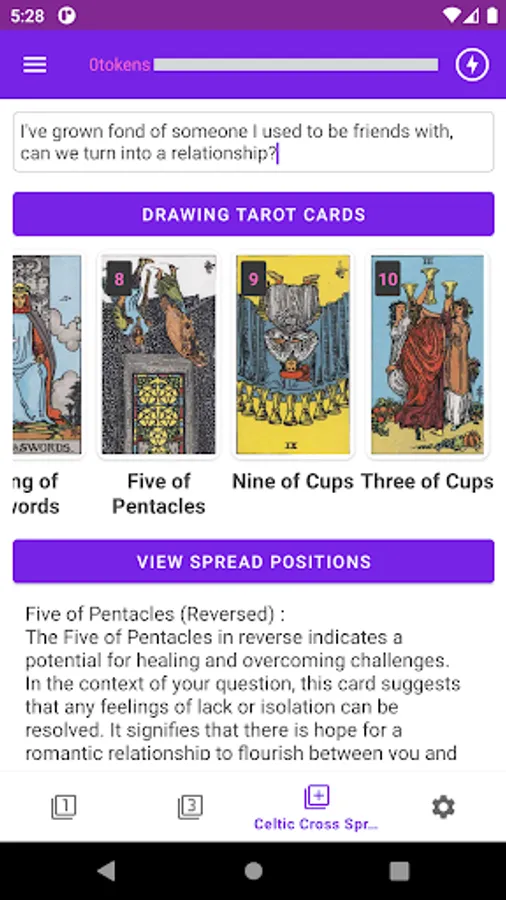 Tarot Card Interpretations: The app selects the appropriate Tarot cards based on the user's questions and provides detailed explanations of their meanings. Users can gain insight into their situations and futures through the messages conveyed by the Tarot cards.