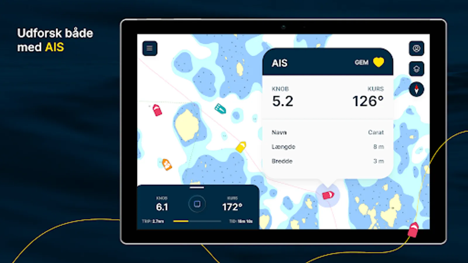 Navigate around with the help of locally adapted charts and aerial photos that you can also download and use offline. Clear instrument panels with speed in knots (SOG) and heading (COG). Customize your field of view with zoom, lock the boat's direction and add the map layers you want, such as ports, AIS boats, your own saved locations and wind and weather forecasts. You can therefore let our anchor alarm keep an eye on the boat's position if you are at anchor.