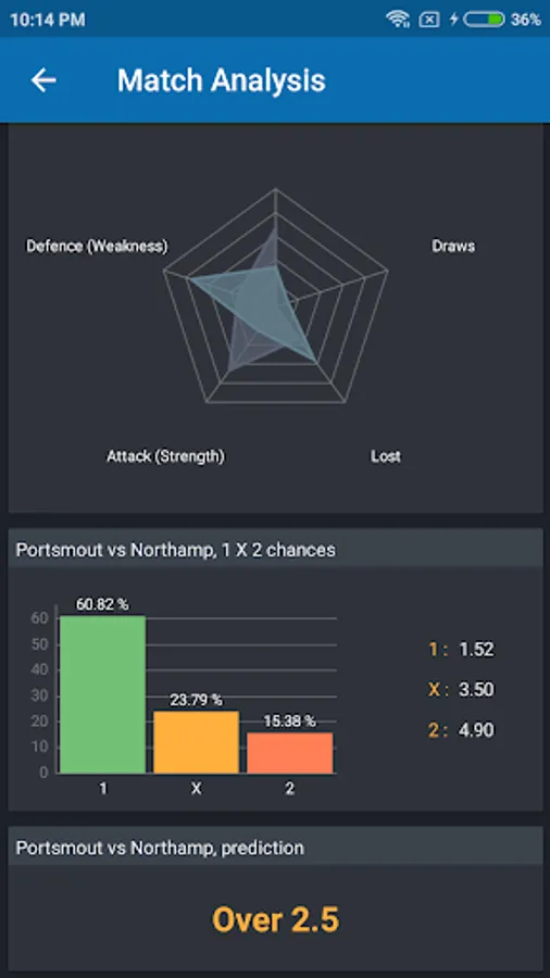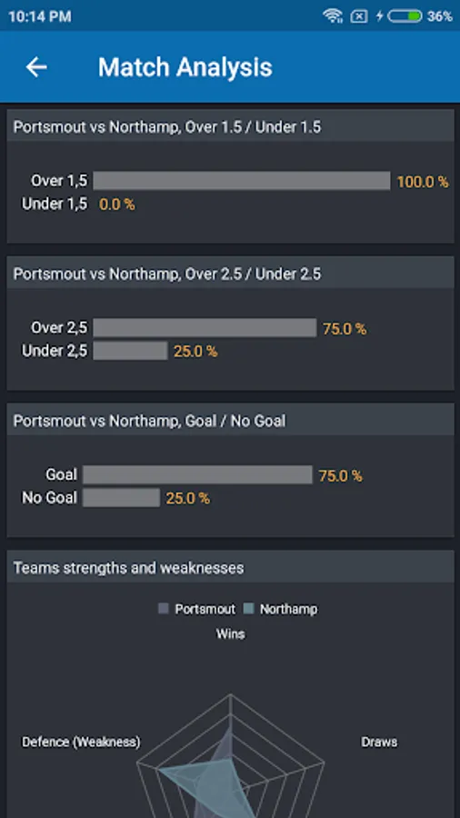 For each match you can have a graph which shows percentages for Win-Draw-Loss (1-X-2) based on an advanced algorithm. It is produced after deep learning analysis on the match.