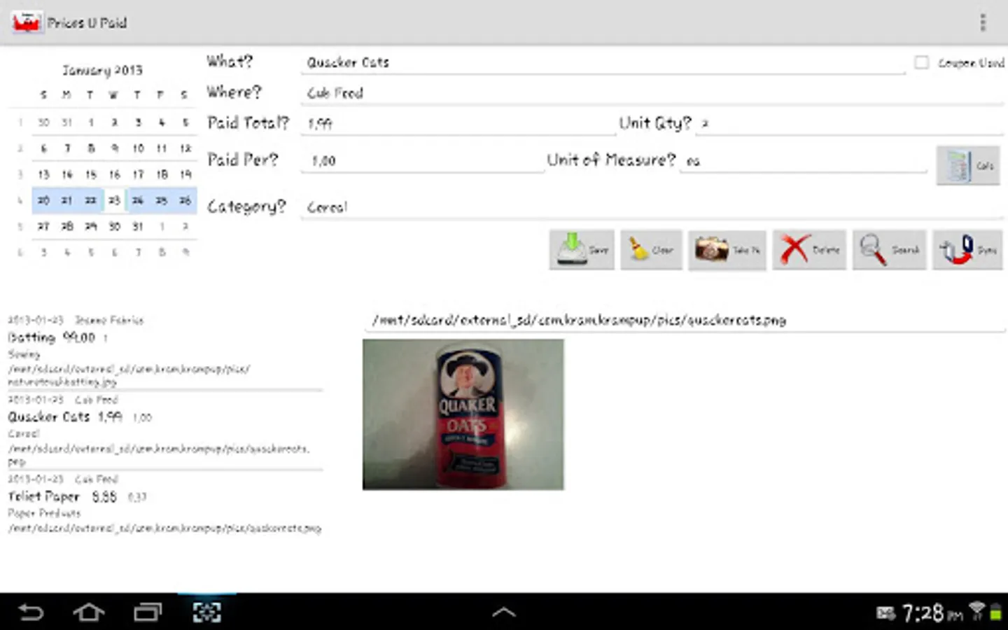 Track your purchases by date, product, price, price per unit, location, category and even if a coupon was used for the purchase. Very helpful when comparing your prior purchases to any future purchase. You can even sync historical purchase information from your tablet to your mobile phone with the corresponding Prices U Paid On The Go mobile application.