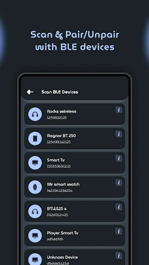 ☑️ Scan BLE Devices: This feature scans available Bluetooth devices around you. With the filter devices option, so you can connect it more safely. There is also a pair/unpair option so you can directly pair their device.
