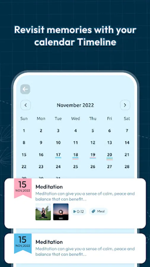 Search for your diary entries based on media content. If you have added voice notes, videos, or images to your diary entries, app will show you that media content on another feature. By clicking on that media content, you can navigate to your diary entry and read it.