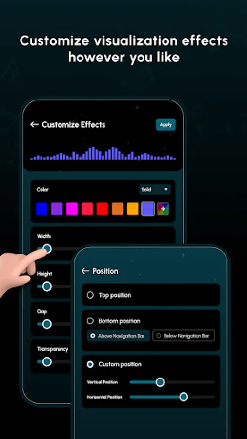 -- Position : Set position of music visualizer to top position, bottom position or custom position (Vertical / Horizontal).