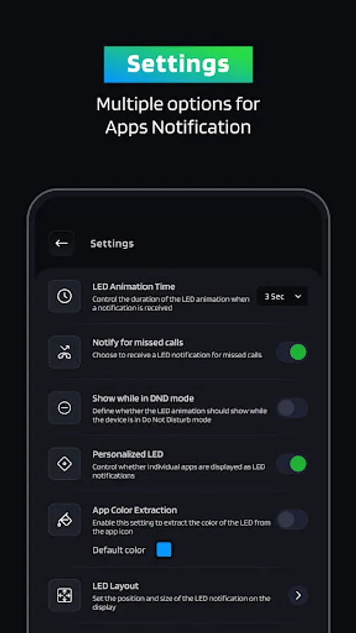 - Battery Optimization: Specify the minimum battery level required for LED notifications to be displayed.
