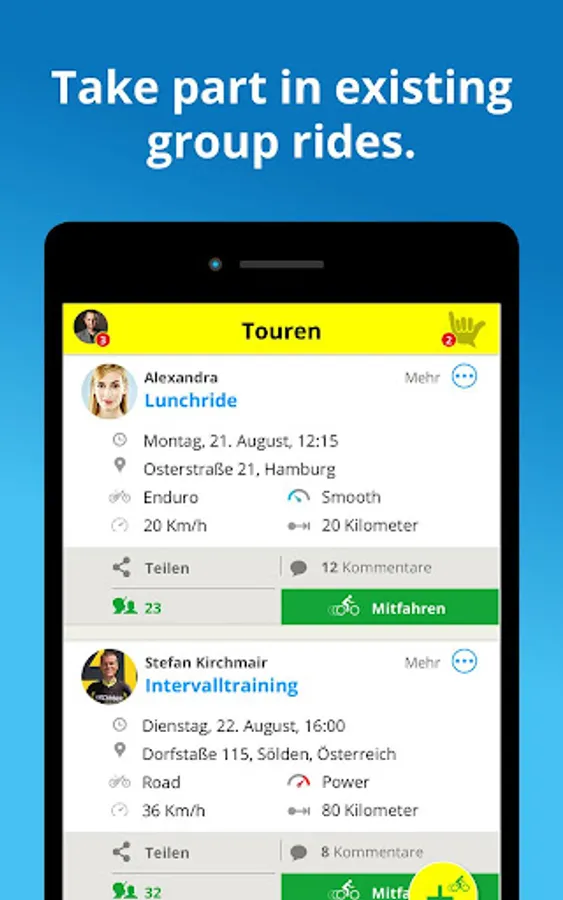 Would you like to drive to work more safely together? Are you on the road and looking for a training partner? Escape from everyday life and cruise through the city in a relaxed atmosphere? Or are you looking for partners for a multi-day bike tour? Then the Cyclists Feed will help you: meet new people for common rides by filtering potential riders by bike type and performance level. Or make new contacts via the Swiper completely uncomplicated.