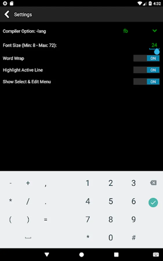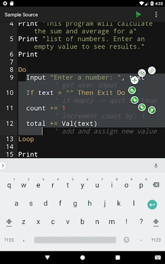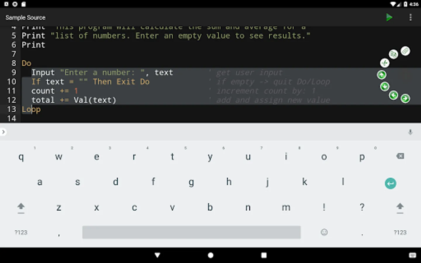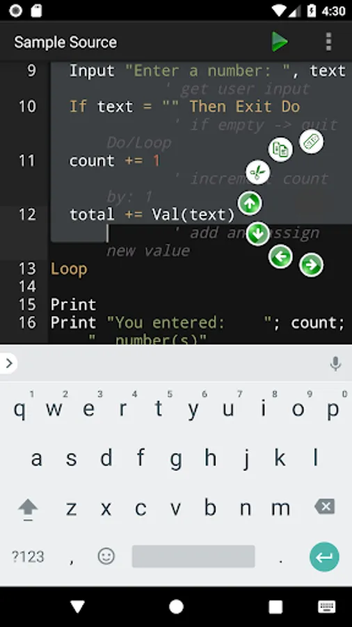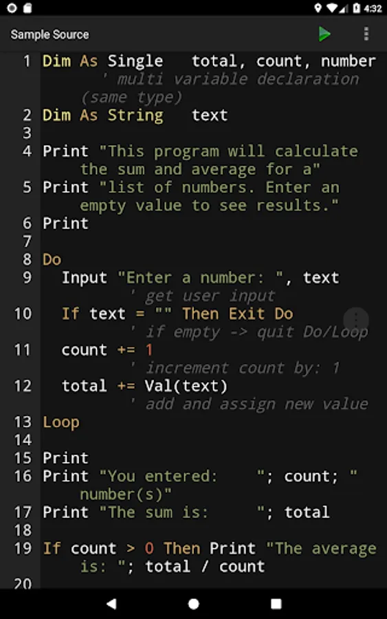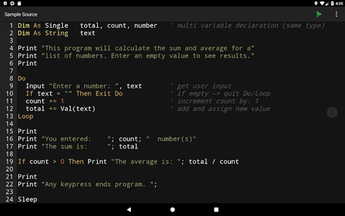 BASIC (Beginner's All-purpose Symbolic Instruction Code) is a family of general-purpose, high-level programming languages whose design philosophy emphasizes ease of use. This app uses the free/open source (GPL) FreeBASIC compiler (https://www.freebasic.net) as backend. FreeBASIC is a high-level programming language supporting procedural, object-orientated and meta-programming paradigms, with a syntax compatible to Microsoft QuickBASIC.