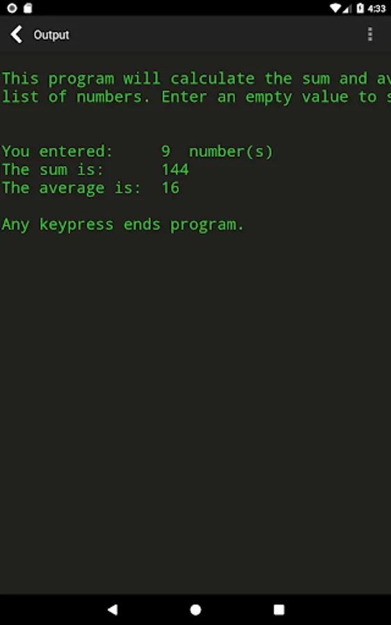- This is a batch compiler; interactive programs are not supported. If your program provides an input prompt, enter the input in the Input tab prior to compilation. See the Reference tab in the app for code examples