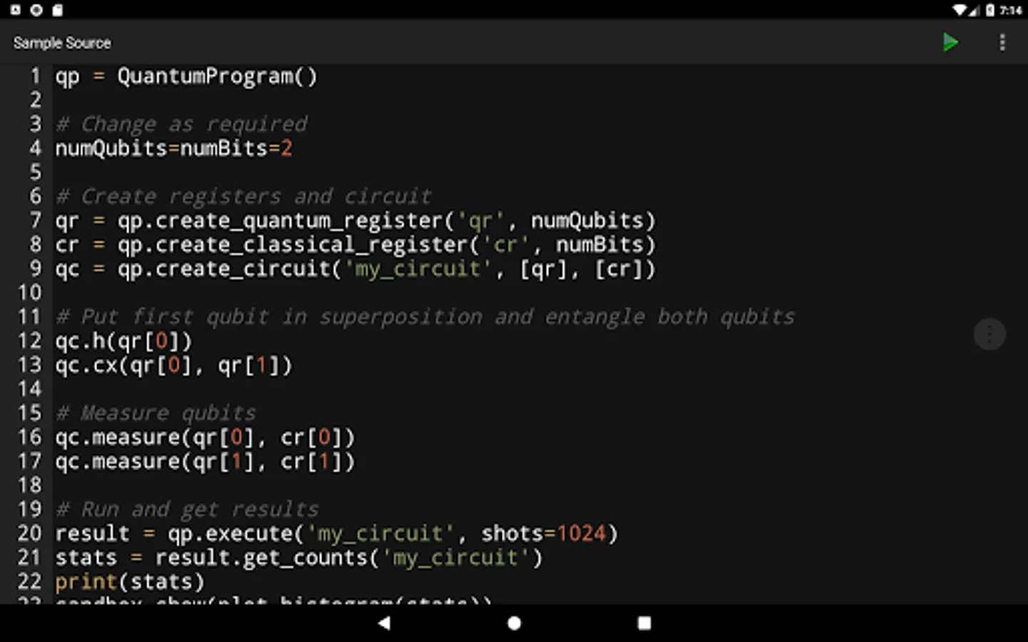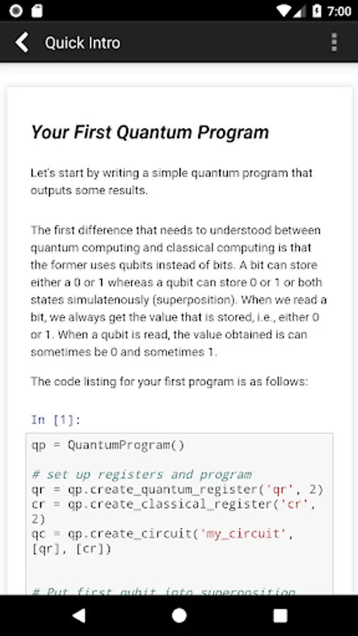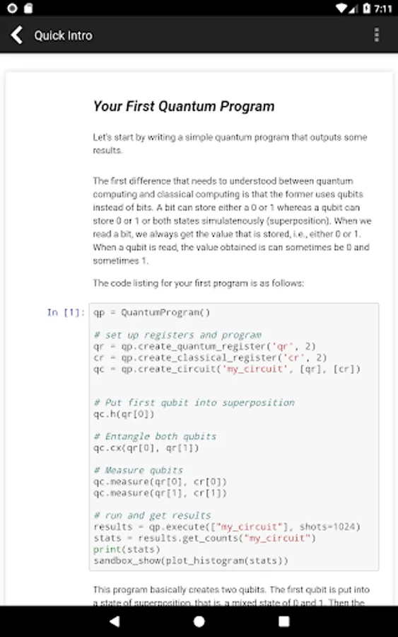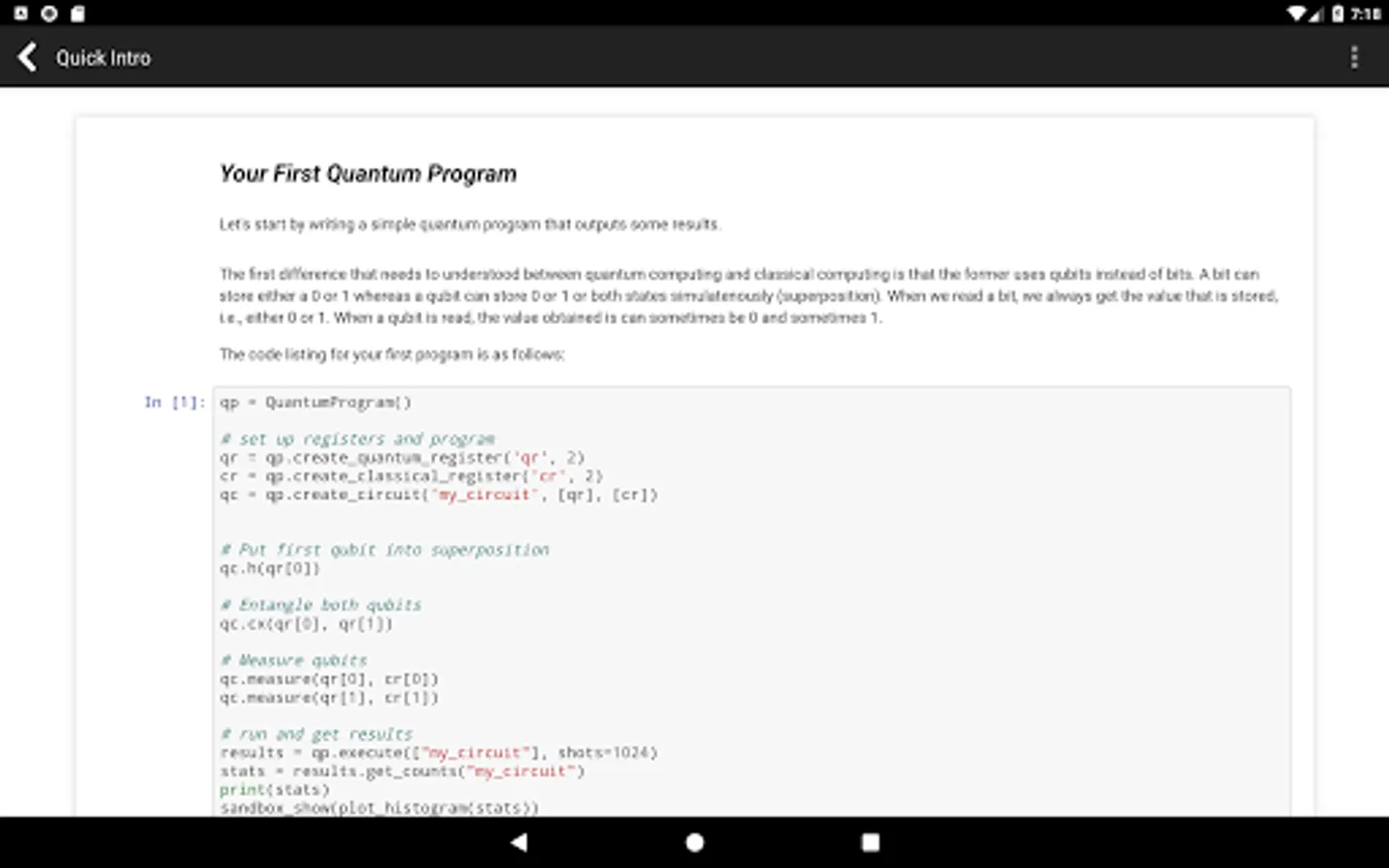 Quantum computing is touted as the next big thing in the computer revolution! The app allows you to learn and program in quantum! It is intended for anybody who has at least some basic programming skills. The tutorials are designed for beginners as well as professionals. The app uses the QISKit SDK and simulator (https://github.com/QISKit/qiskit-sdk-py) licensed under Apache 2.0. Coding is done in Python 3.5.