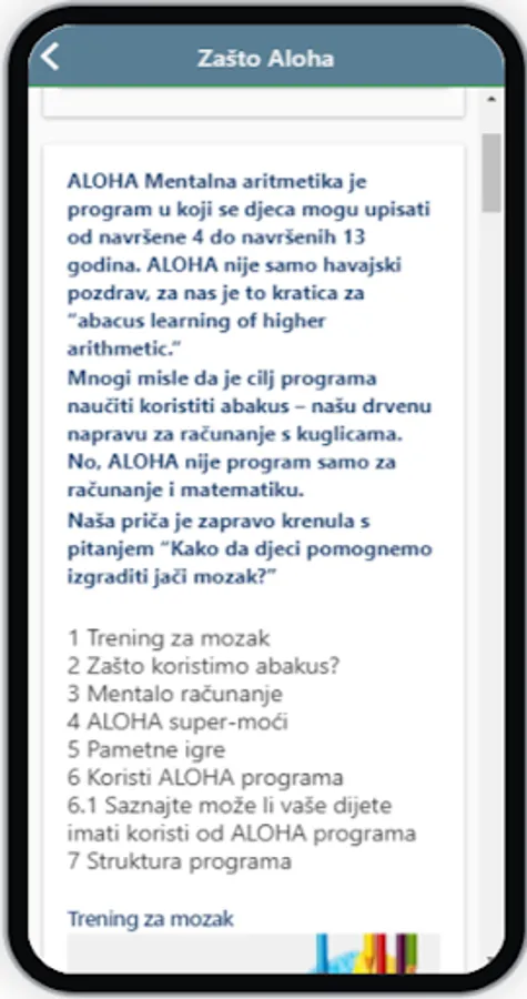 The Aloha mental arithmetic application is primarily intended for users of the Aloha mental arithmetic program. Aloha-mental arithmetic is a program of mental and intellectual development in which children can enroll between the ages of 4 and 13 years. The basis of the program is scientific brain research, and the goal is to create a stronger brain using abacus and "mental computing". Through the application itself, program participants can share experiences and be familiar with events related to the Aloha Mental Arithmetic program.