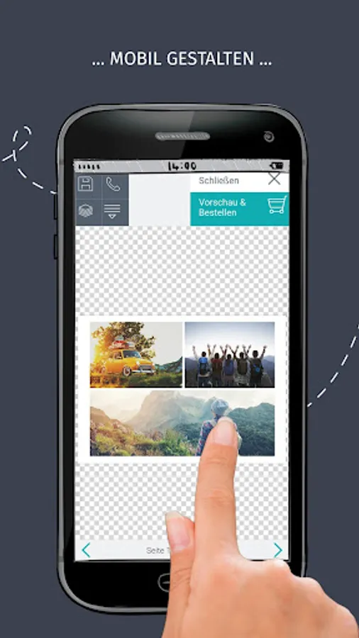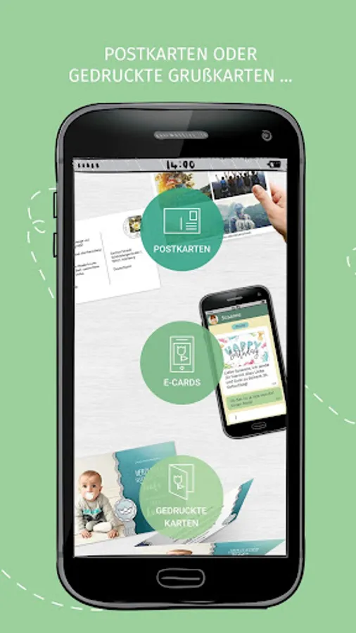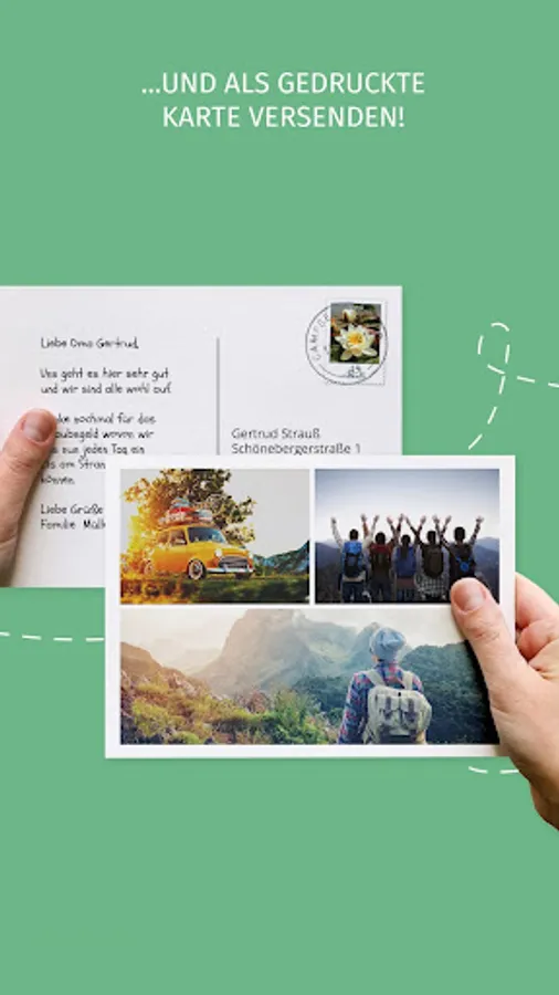 You can access a variety of designs and insert your own images directly from the phone. Write your greeting and the recipient's address on the postcards in no time.