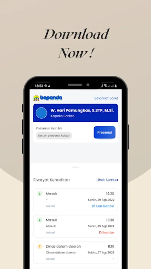Megawe Bapenda is an application for monitoring the performance of Serang City Regional Revenue Agency employees in real time using location coordinates. This application is to monitor employees who are present at the office, employees who are in the field, employees who are on permission, employees who are sick and employees who are on official trips.