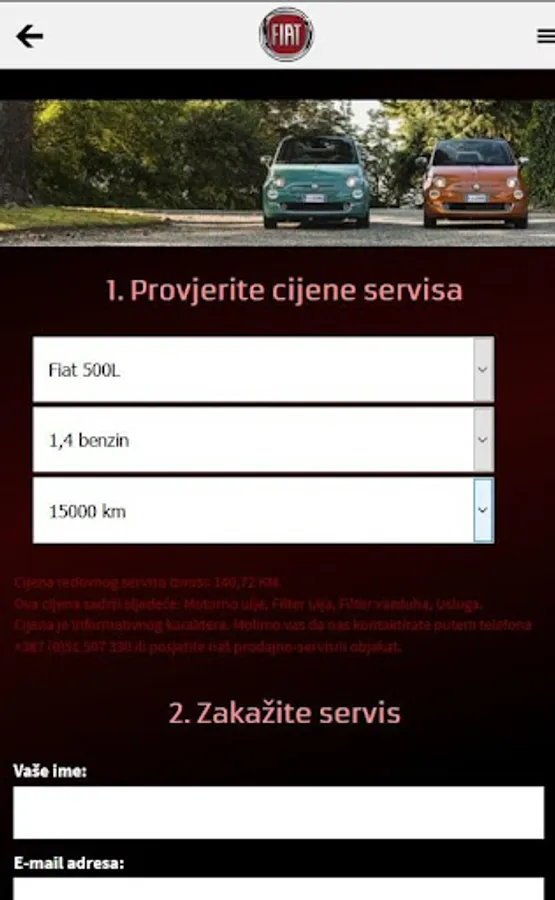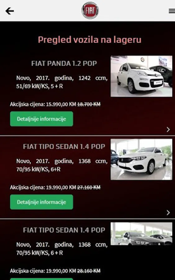 Aplikacija vam daje uvid u aktuelnu gamu modela Fiata na BiH tržištu, a u mogućnosti ste da pogledate lager dostupnih vozila sa kratkim rokovima isporuke.