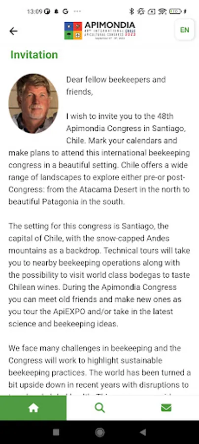 I wish to invite you to the 48th Apimondia Congress in Santiago, Chile. Mark your calendars and make plans to attend this international beekeeping congress in a beautiful setting. Chile offers a wide range of landscapes to explore either pre-or post-Congress: from the Atacama Desert in the north to beautiful Patagonia in the south.