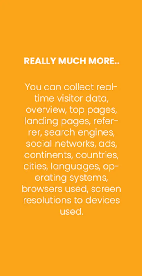 With this application, you can collect realtime visitor data, overview, top pages, landing pages, referrers, search engines, social networks, ads, continents, countries, cities, languages, operating systems, browsers used, screen resolutions to devices used. .