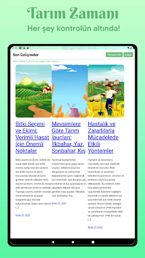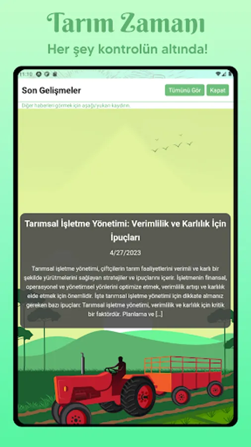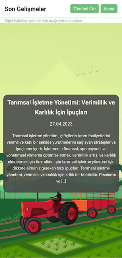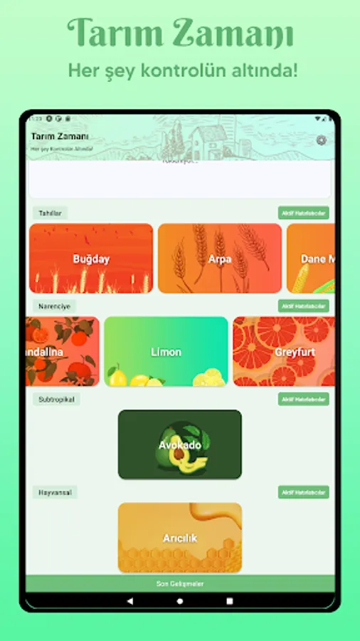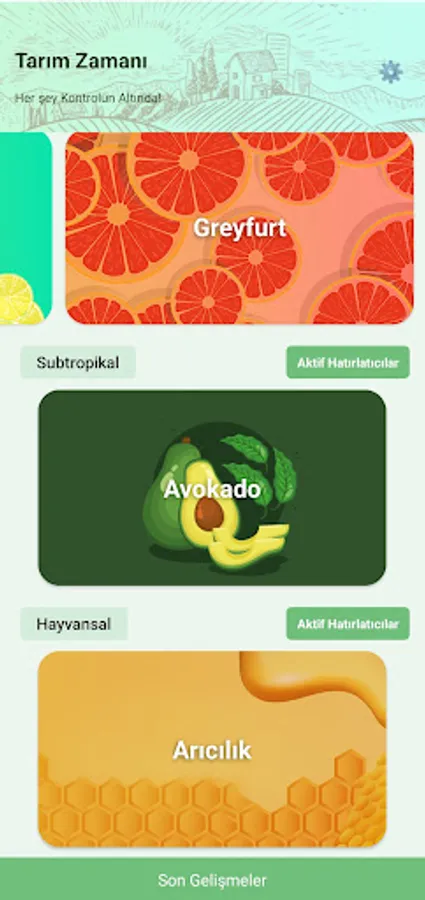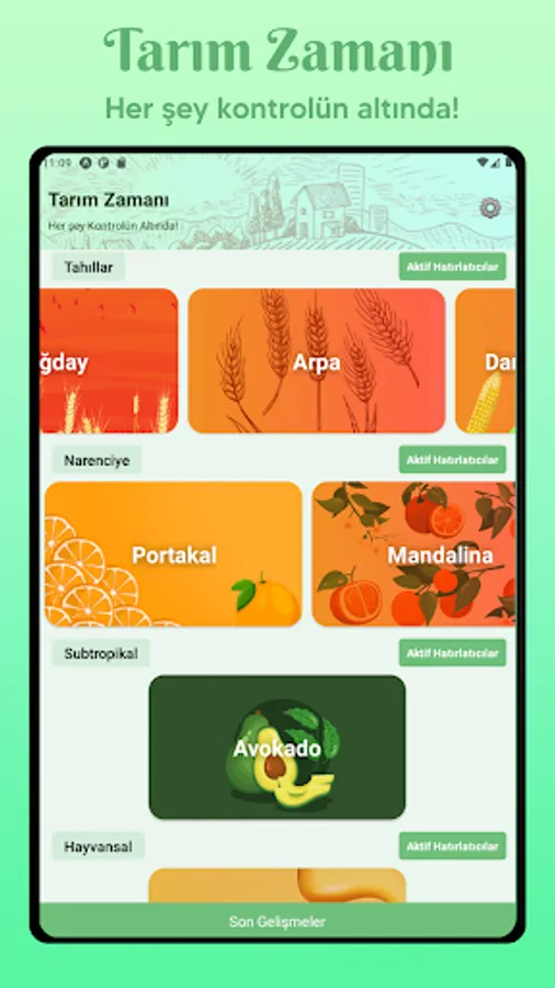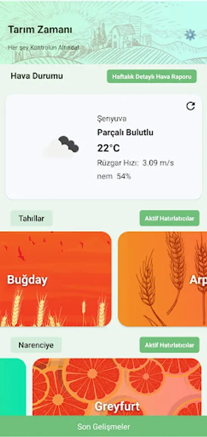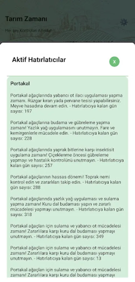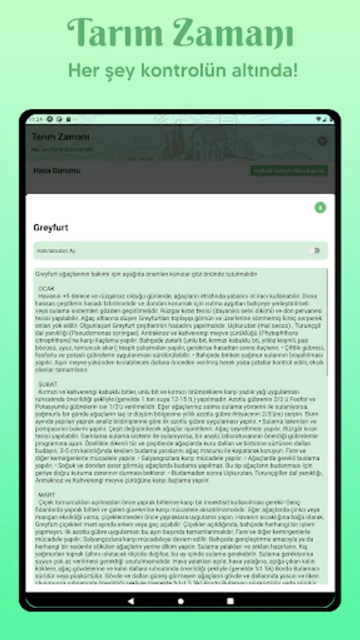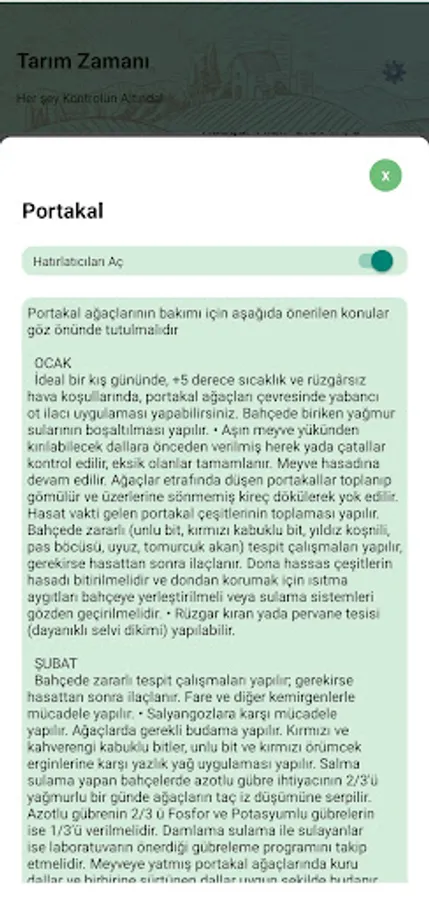 This application, prepared for entrepreneurs in the agricultural sector, will inform users about agricultural activities, with a focus on the "Mediterranean Region." It will facilitate timing, make it easier to track critical weather conditions, create time for planning and precaution, and increase yield. The app will send reminders for agricultural activities like pruning, planting, watering, fertilizing, spraying, and harvesting to be done at the right time.