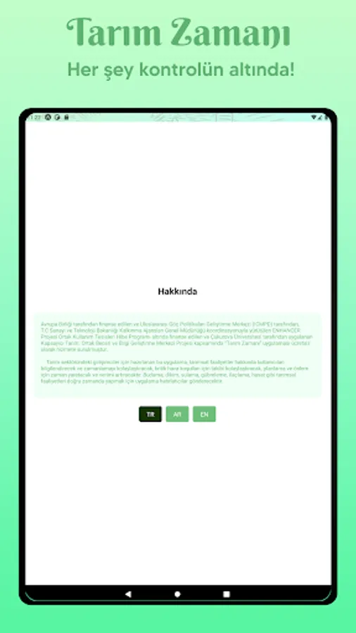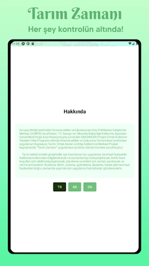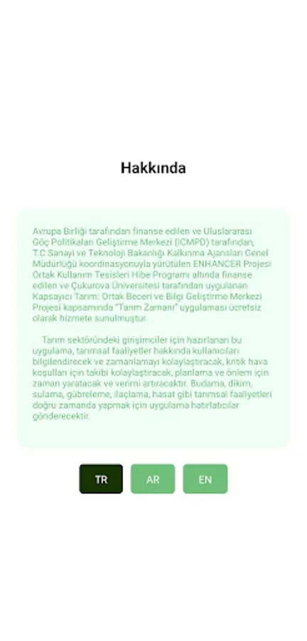 The Farming Time application has been made available free of charge as part of the Inclusive Agriculture: Common Skills and Knowledge Development Center Project, implemented by Çukurova University and financed under the Common Usage Facilities Grant Program of the ENHANCER Project, funded by the European Union and coordinated by the International Center for Migration Policy Development (ICMPD) in coordination with the General Directorate of Development Agencies of the Ministry of Industry and Technology of the Republic of Turkey.