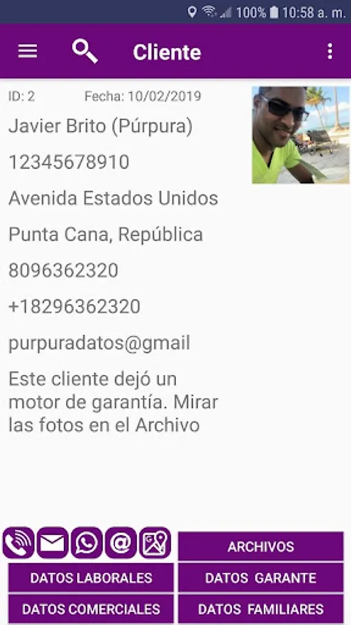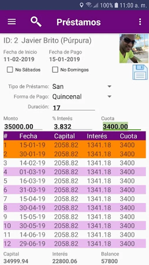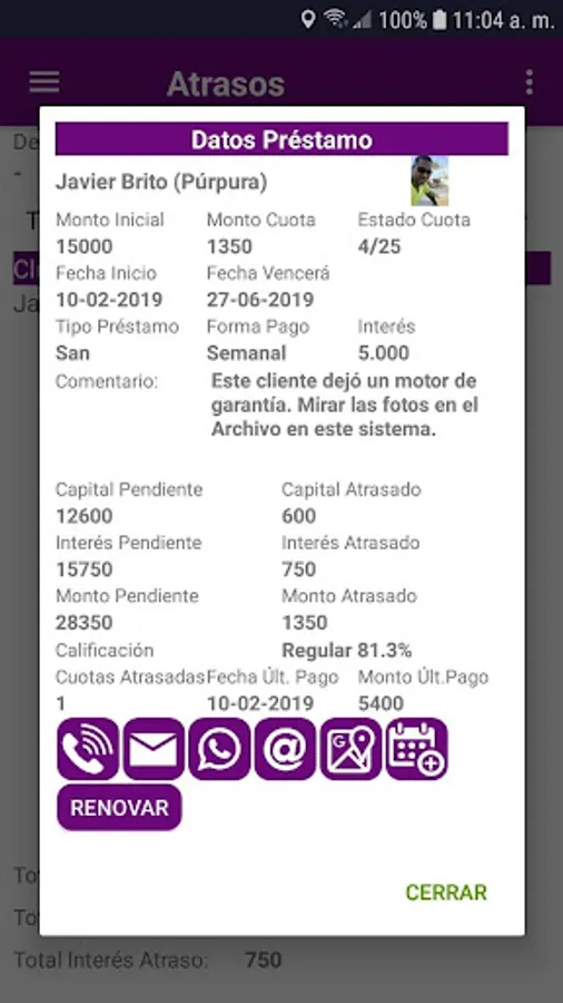 -Unlimited Clients and Loans of all types and forms; all the reports that you need to know automatically generated; All documents can be printed, including the Loan Note, in a mini portable printer format that you can connect to your mobile via Bluetooth; Constant notification of Arrears; access to the location and direct communication with your client; history of everything accomplished; we allow you to make mistakes and correct them; creation of an alarm with automatic location to reprogram reminders of payment dates and collection routes; all automated processes and easy to use.