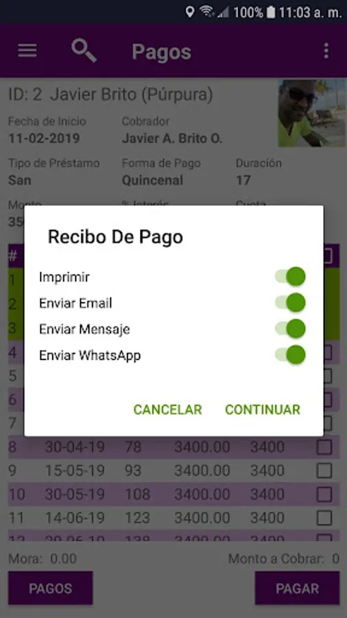 - Collection of your complete Loan Portfolio through Text Messages with just three clicks. (Cost of Messages covered and guaranteed by Púrpura Datos, S.R.L.)