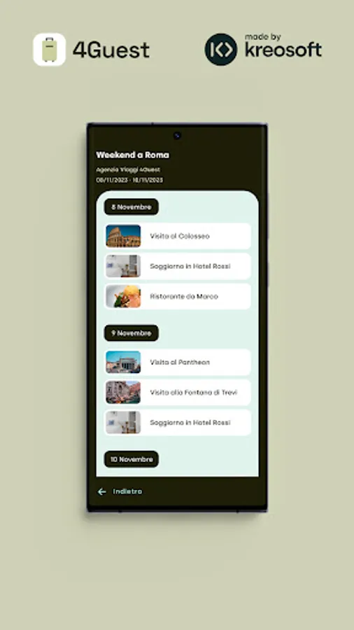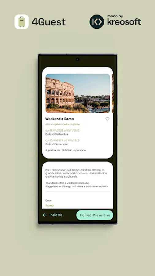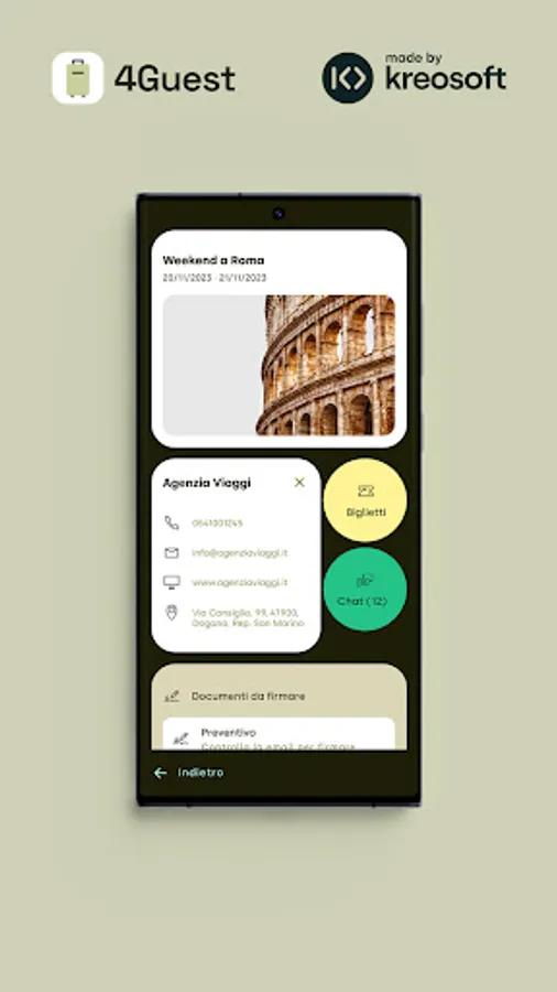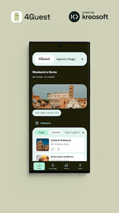 The 4Guest app improves the travel experience of Travel Agency customers. The traveler will receive his itinerary in digital format that can be consulted directly on the app. By simply entering a code, you will have access to the complete travel program with the points of interest indicated, the documents, the description of all the stages with timetables, info and map.