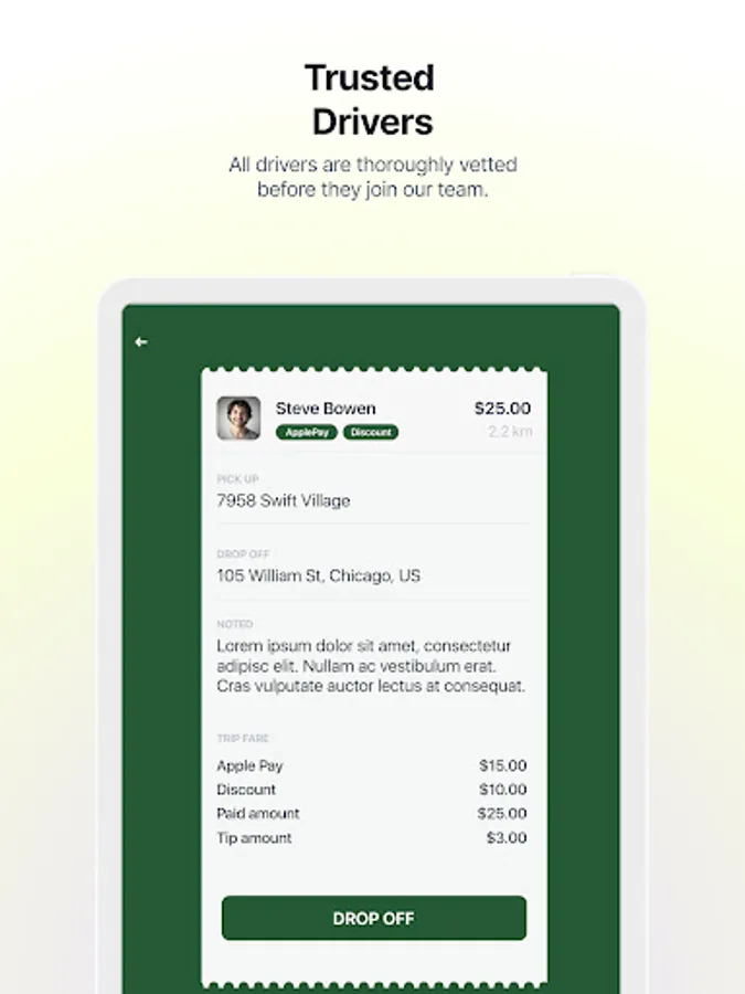 Our user-friendly app lets you easily schedule a ride, track your driver in real time, rate your ride experience, and handle all payments securely within the app. It’s all designed to provide a seamless and hassle-free experience.