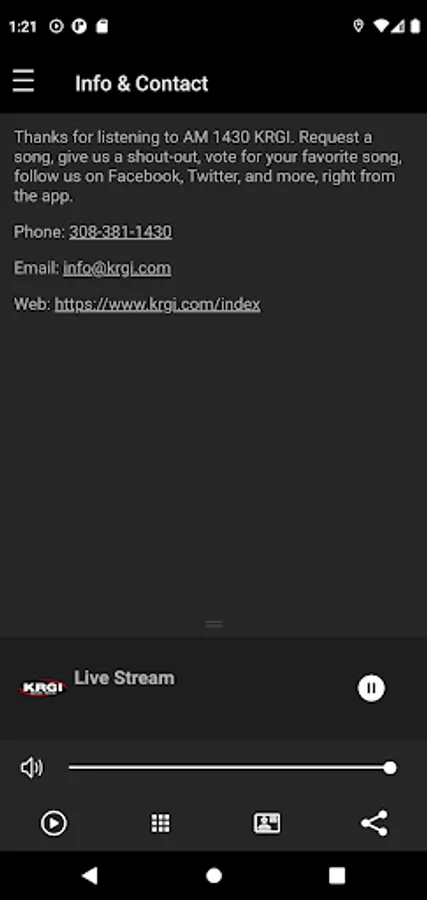 AM 1430 is your online connection to local news and events in Grand Island and the state of Nebraska. Plus, the top Talk shows and Ag Programs. Download the app and start listening to AM 1430 KRGI today. Tune in and listen all day, no matter where you are. Check out our App Features: Live Feed, Album artwork and song information of what's currently playing, Album artwork on the lock screen, Playlist History, 'Buy Song' for the current song that's playing, Connect with the stations by sending us a shout out or check out our Facebook and Twitter Feeds, Share with your friends and more. Download the app for free and start listening. Enjoy!