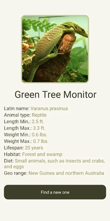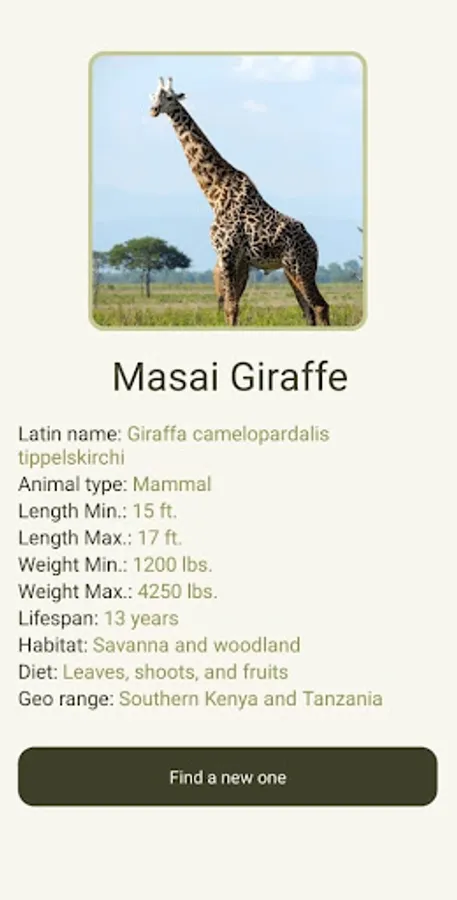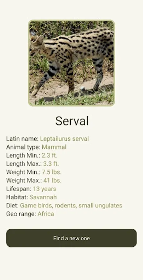 Here you will be able to randomly meet various animals and their characteristics, such as name, type, maximum and minimum weight, average life and among others.